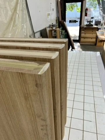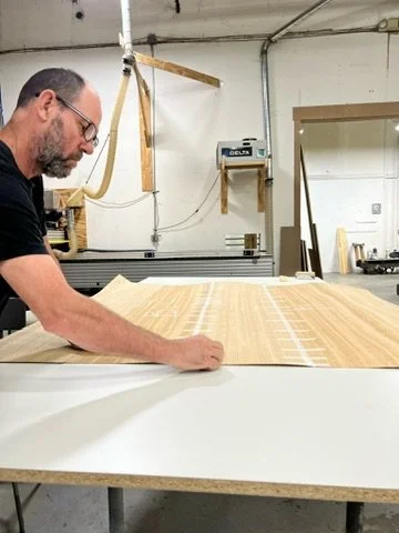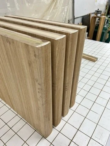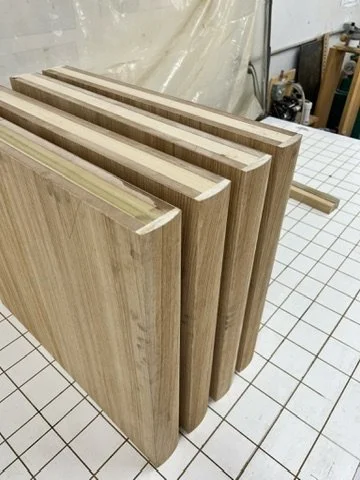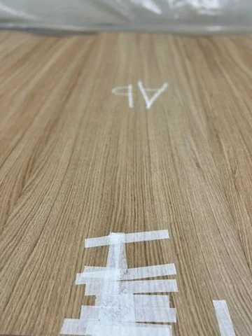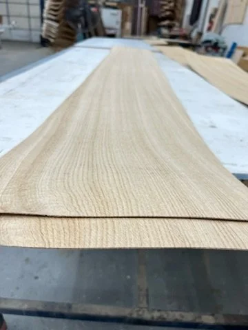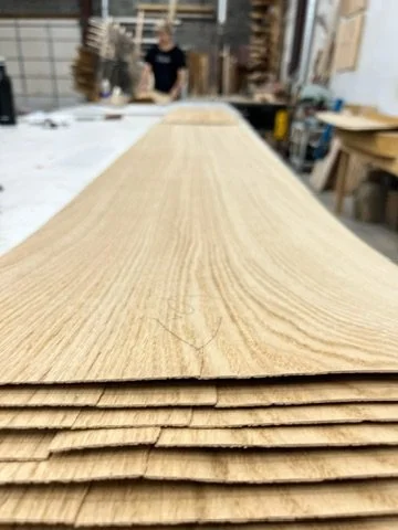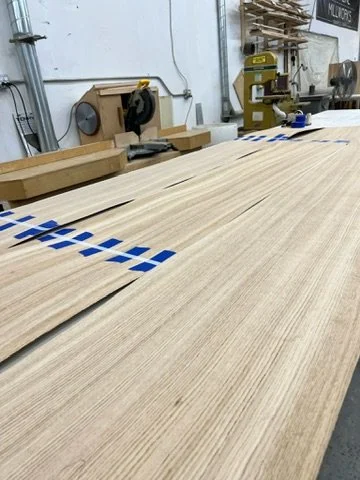 Each veneer flitch was sequentially cut and unfolded one sheet at a time. This careful handling allowed for precise slip-matching and book-matching, while preserving the tight, linear grain characteristic of rift-sawn white oak. The design direction also called for the grain to run perpendicular to the table’s long axis—an approach that ensured uniformity across the four-foot width of each section.