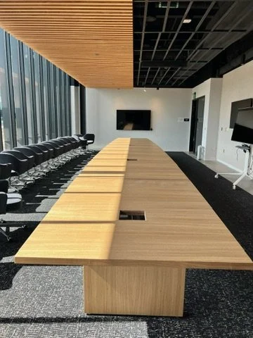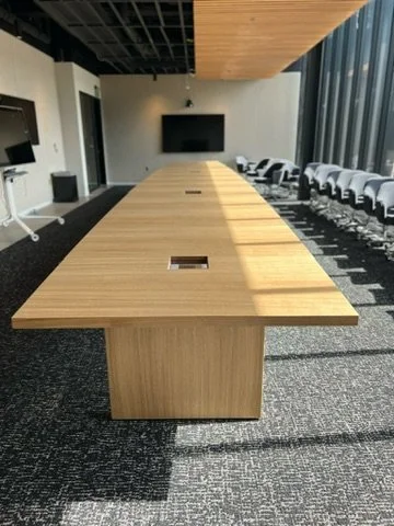 This piece could not be purchased or adapted from a standard manufacturer. It needed to be engineered, built, and finished specifically for this space—accurate to the architect’s geometry, aligned to the ceiling slats above, and scaled to the room’s glass-lined perimeter. The result is a 35-foot rift-sawn white oak conference table built with institutional durability and museum-level craftsmanship.