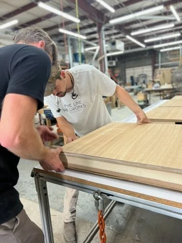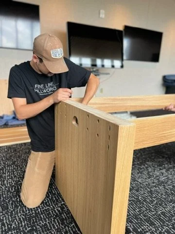 To ensure a seamless installation, the entire table was assembled in full inside Fine Line’s fabrication wing—first during fabrication and again after finishing—to confirm alignment and pre-plan the modular sections required to navigate building corridors and doorways. This “assemble → finish → assemble again” process is a hallmark of Fine Line’s approach to complex architectural millwork.